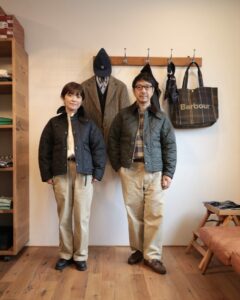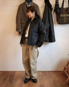 Barbourのキルティングジャケットを使ったリンクコーデは、シンプルながらも上品さがあり、男女ともに楽しめるスタイルです。